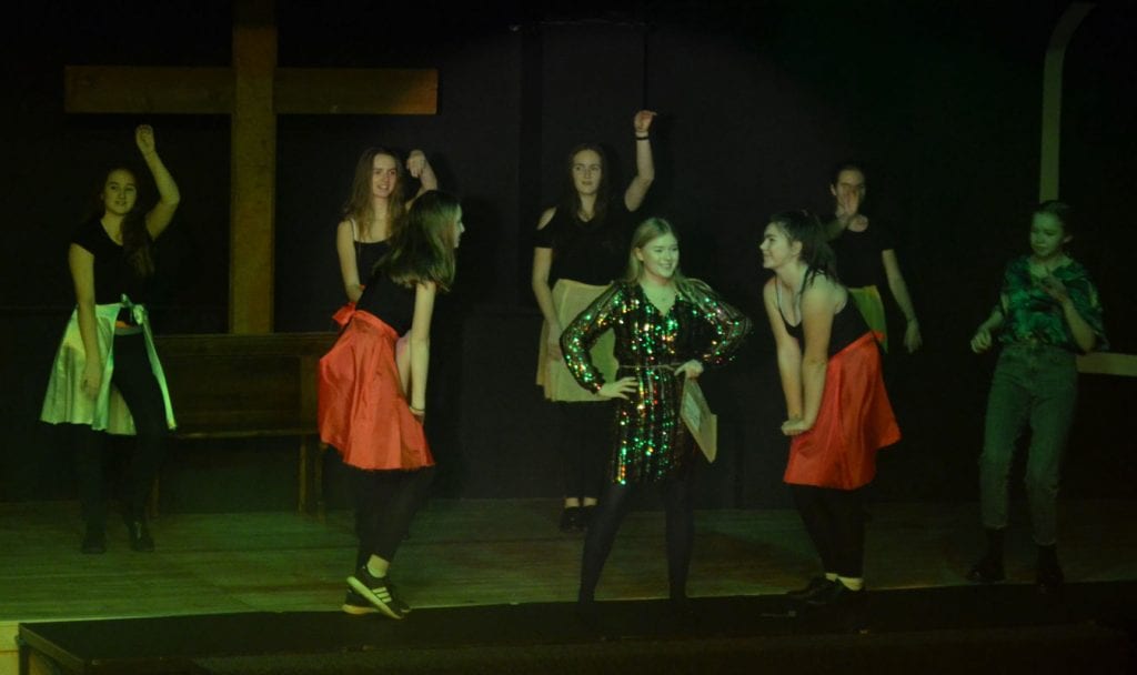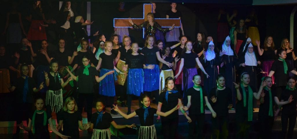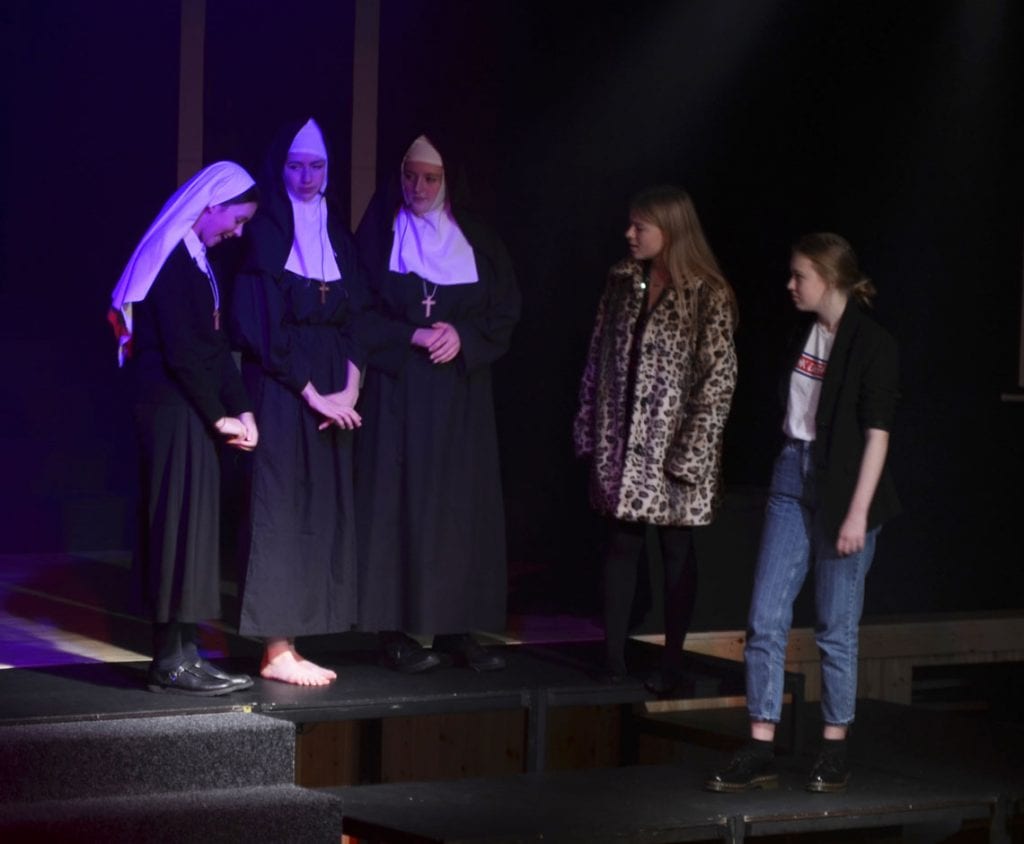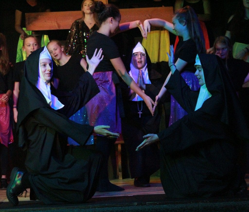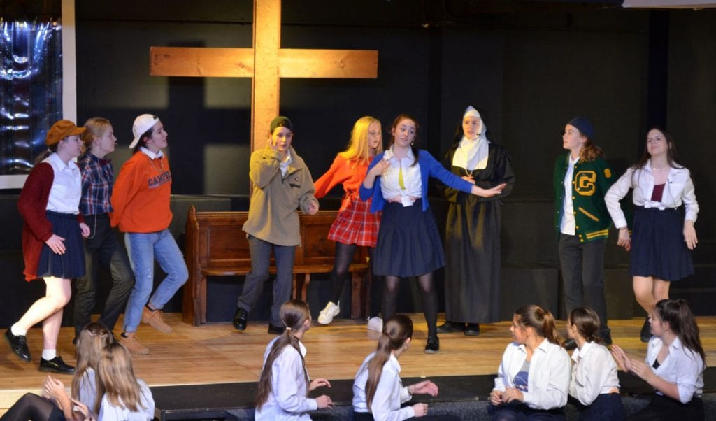 The resulting performance was joyful to behold, with uplifting songs alongside the transformation of badly behaved, disengaged pupils, who were whipped into a winning competition choir by the fabulous lounge singer Delores Van Cartier (the heroine) played by the extremely talented Maisie O. Eva N, as Sister Mary Lazarus, with her superb comedy timing, gave the audience some hilarious moments too. Superb vocal performances came from Alana F-B as the divisively forthright Rita and Amy D with her amazing vocal range, showcased as Amy Kako. Many others deserve a mention but safe to say there was not a weak performer on the stage.